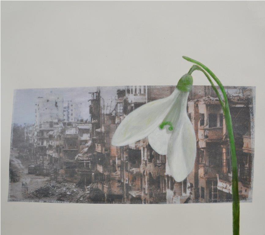 tekening, oilstick op krantenfoto, naar aanleiding van oorlog in Syrie waar ik eerder heb rondgereisd.