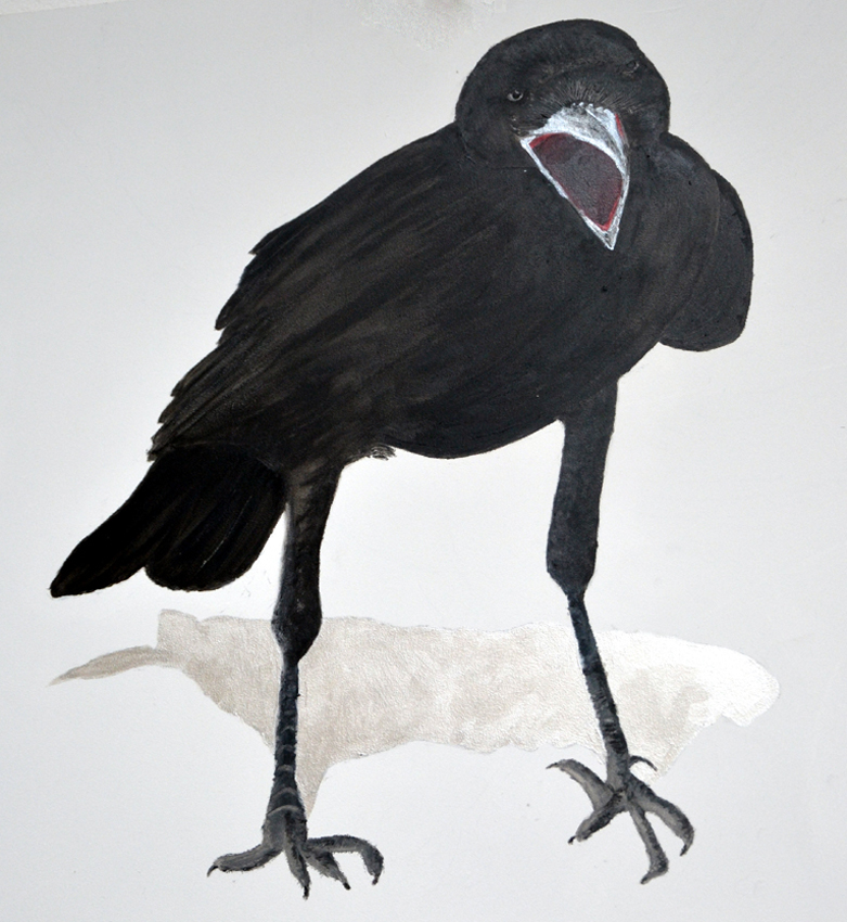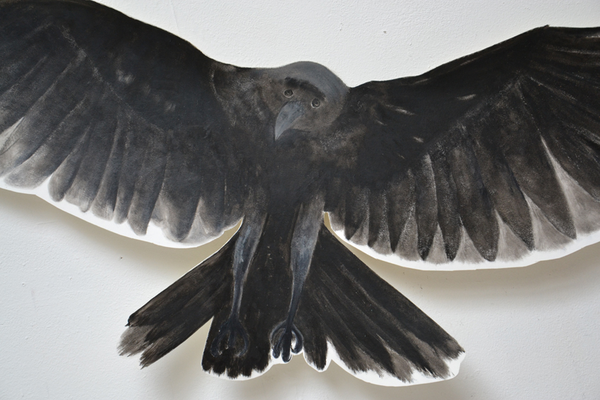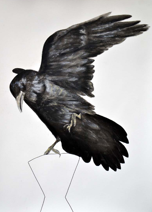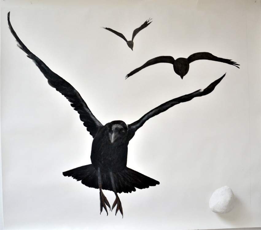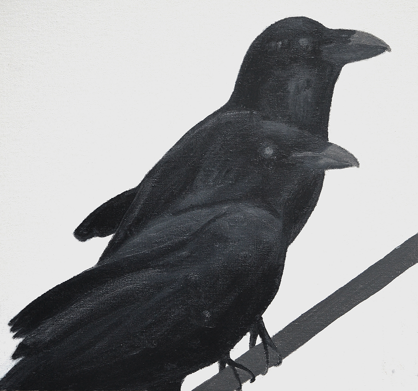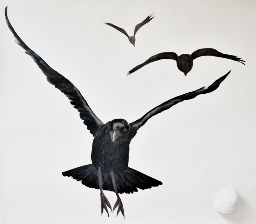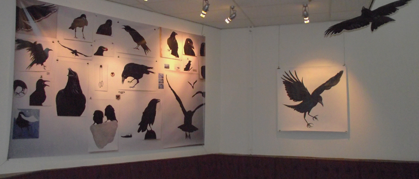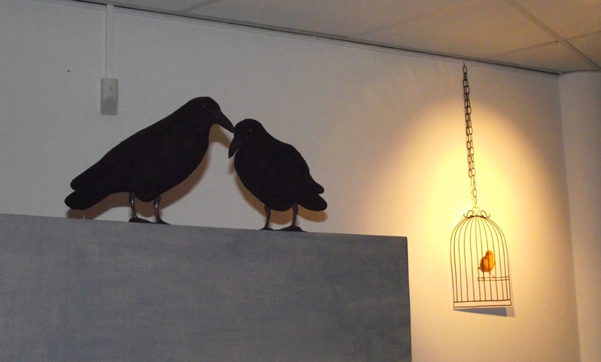 Associatief uitgangspunt voor deze installatie, in Filmhuis de Keizer, is de film ‘the Birds’ (1963) van Alfred Hitchcock geweest. Het was ver voor Jaws en andere films uit het genre ‘de natuur wreekt de mens’. Kraaien kunnen angst inboezemen. Waarom? Doordat ze zwart en groot zijn, krijsen, altijd in de nabijheid en aards zijn? Of door hun intelligentie , de scherpe observerende blik? Wat weten wij van hen en wat weten zij van ons?