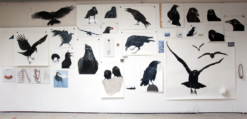 De installatie is opgebouwd uit een fotoprint van 270 x 140 van getekende kraaiachtige vogels, synthetische lokvogels op ware grootte en losse tekeningen. Hitchcock werkte weinig op locatie maar bouwde zoveel mogelijk sets in de studio en gebruikte montagetrucs en syntheziser voor het geluid van de kraaien. Deze werkwijze is overgenomen voor deze installatie. De tekeningen in het atelier zijn op beeldmateriaal overgebracht via fotografie en print. Echt en onecht, natuur en cultuur, werkelijkheid en suggestie.