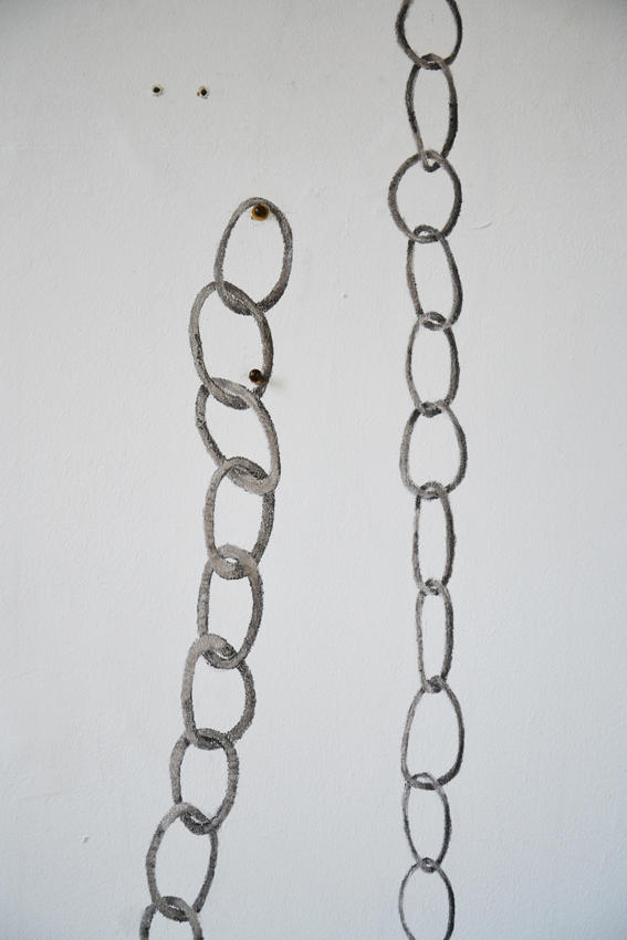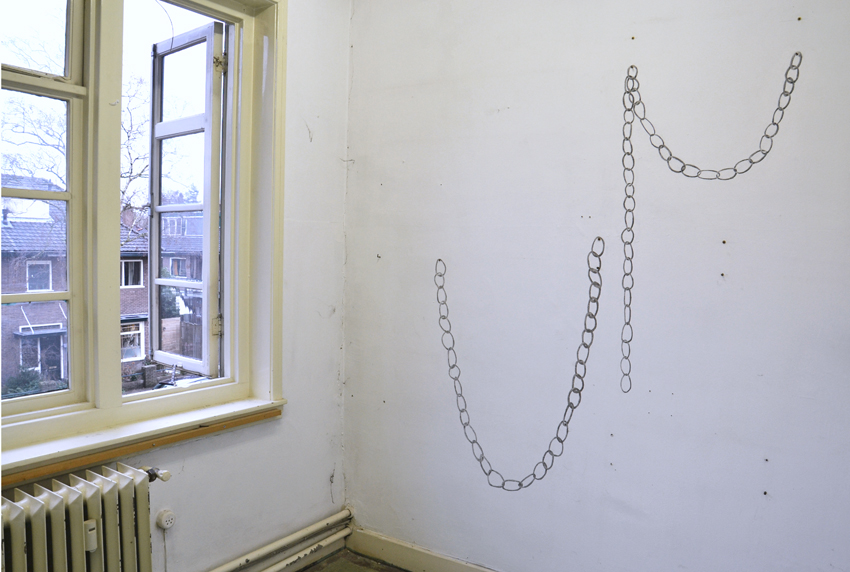 ‘Linked place’: een met houtskool getekende ketting ‘hangt’ aan verlaten schroeven in een voormalig decanenkamertje. Linked verbeeld de verbondenheid van de kunstenaar met het gebouw.‘