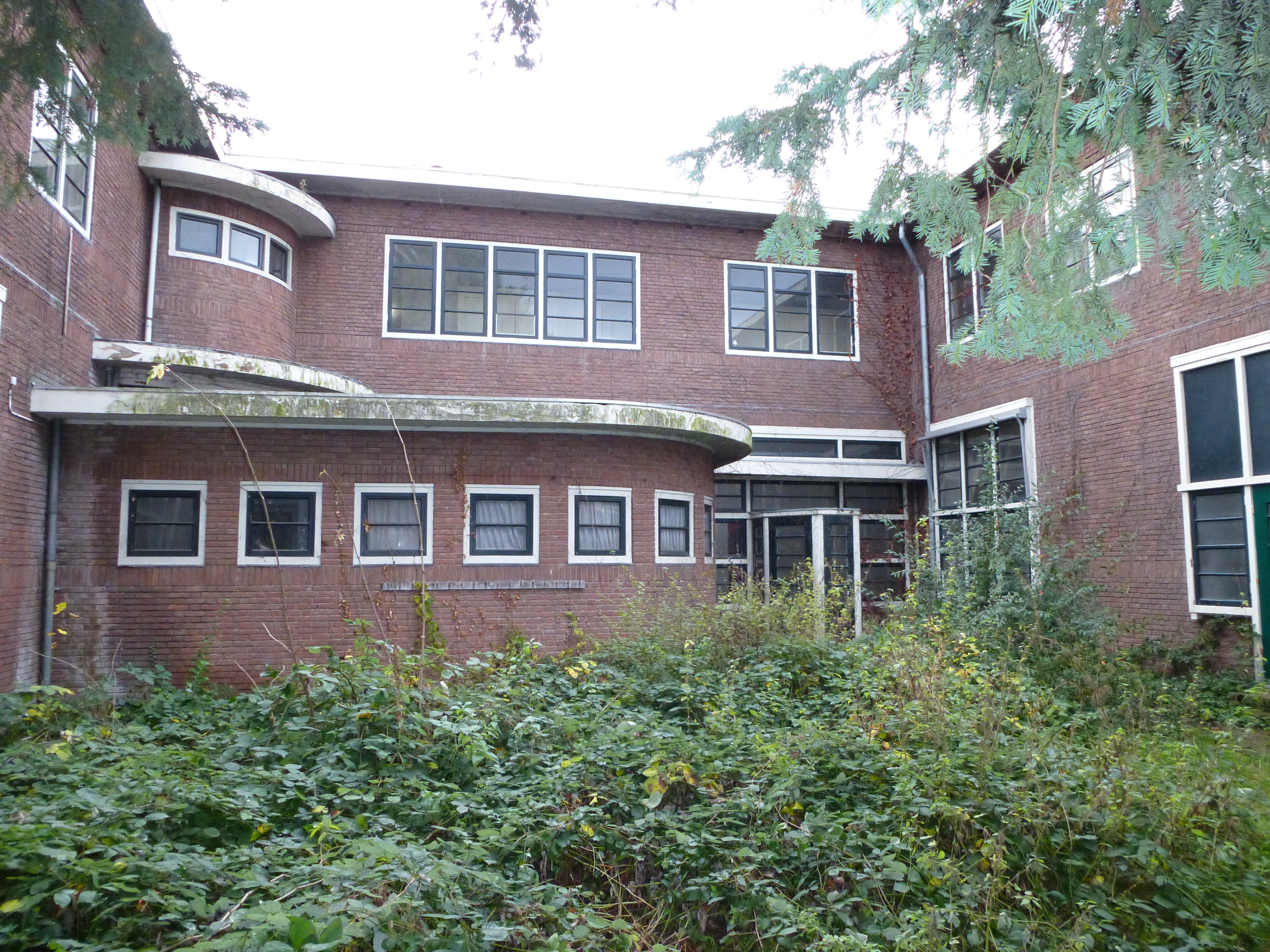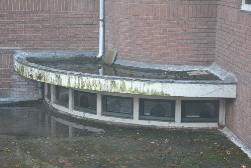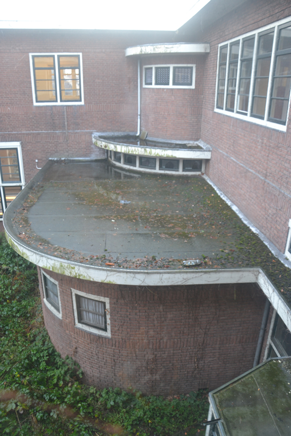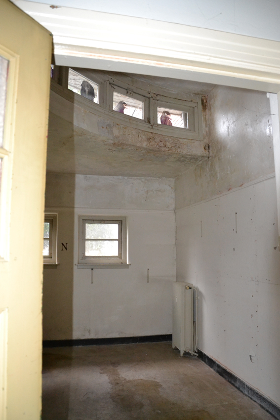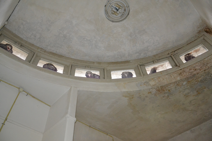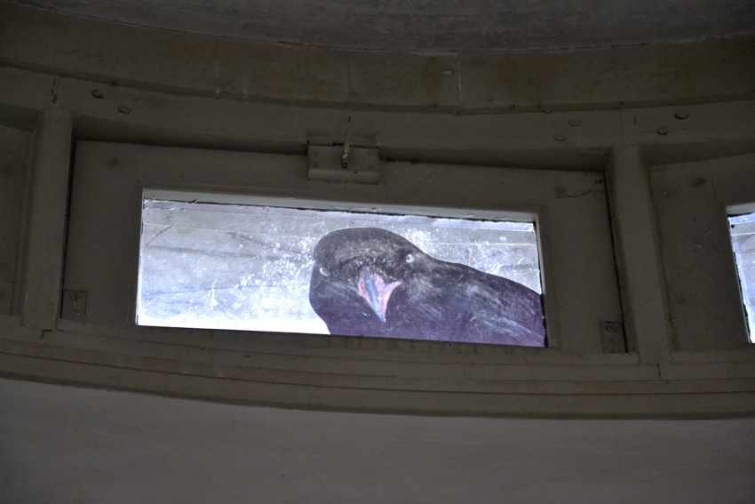 ‘Spied place’: getekende kraaien, geprint op raamfolie, op bovenraampjes. ‘ Spied’ refereert aan het verlangen van omwonenden altijd al te hebben willen weten wat hier binnen gebeurde. ‘ Spied’, ook omdat de natuur de overhand gaat krijgen over dit gebouw. Kraaien verkennen alvast de mogelijkheden.