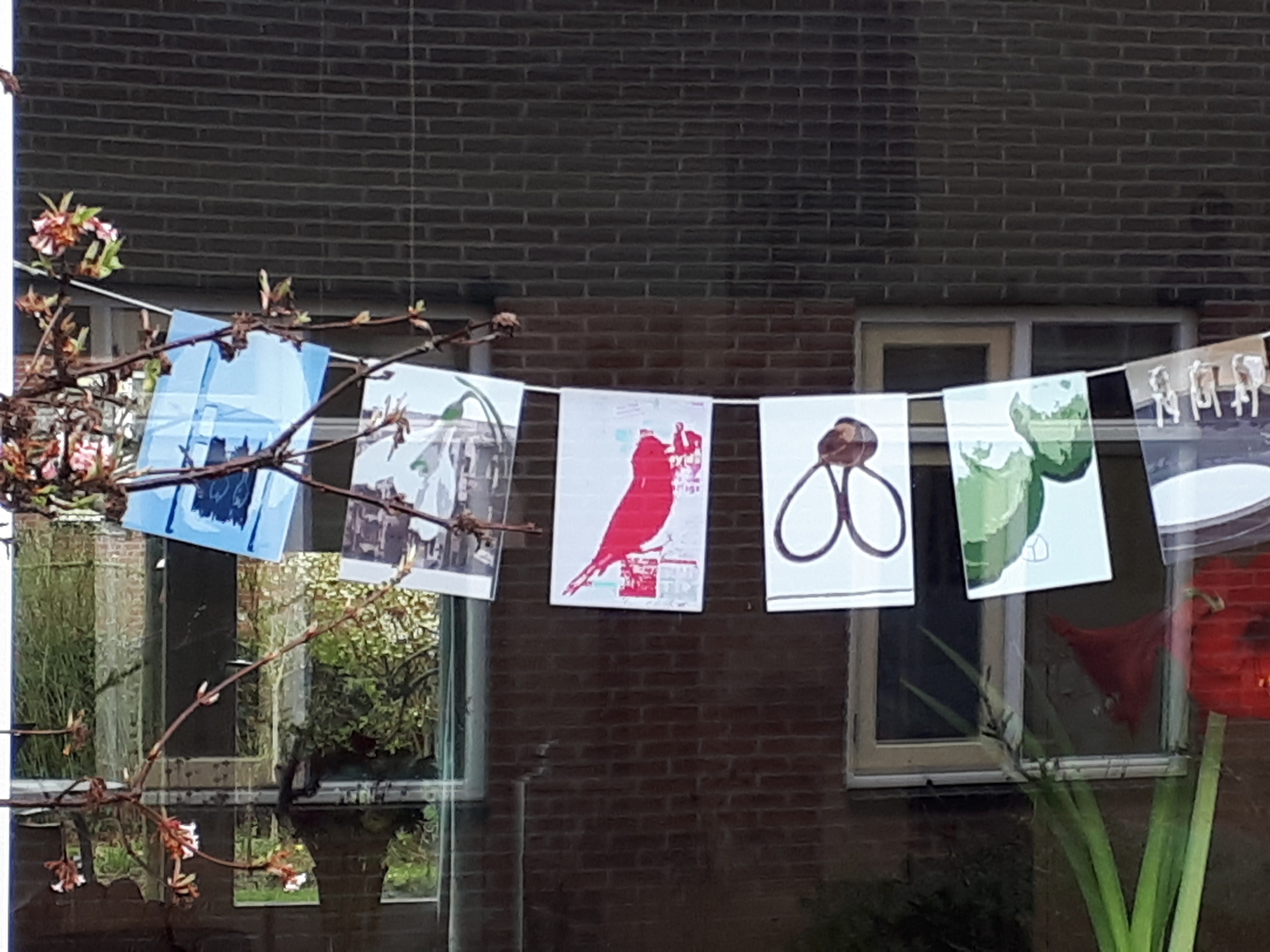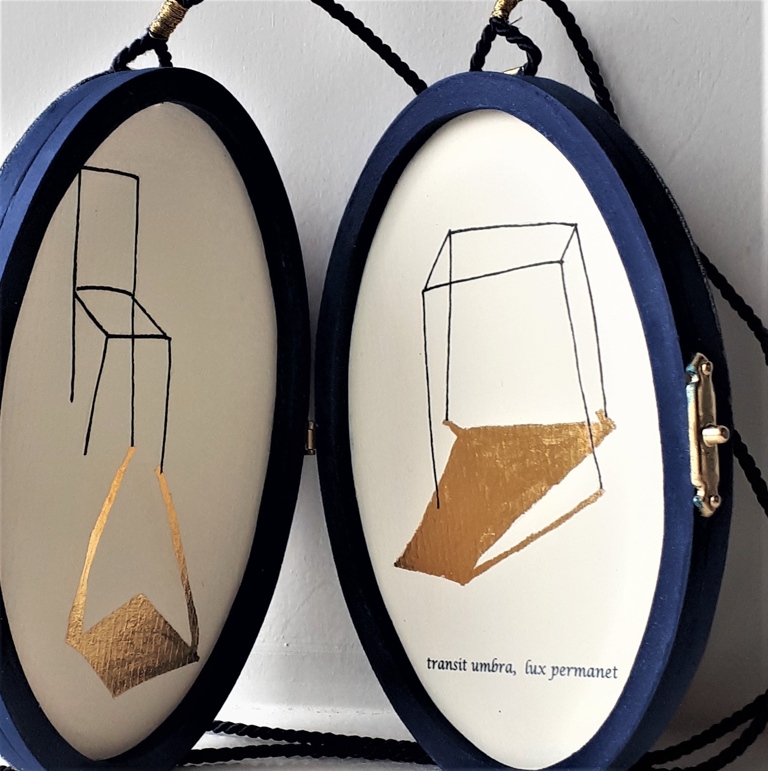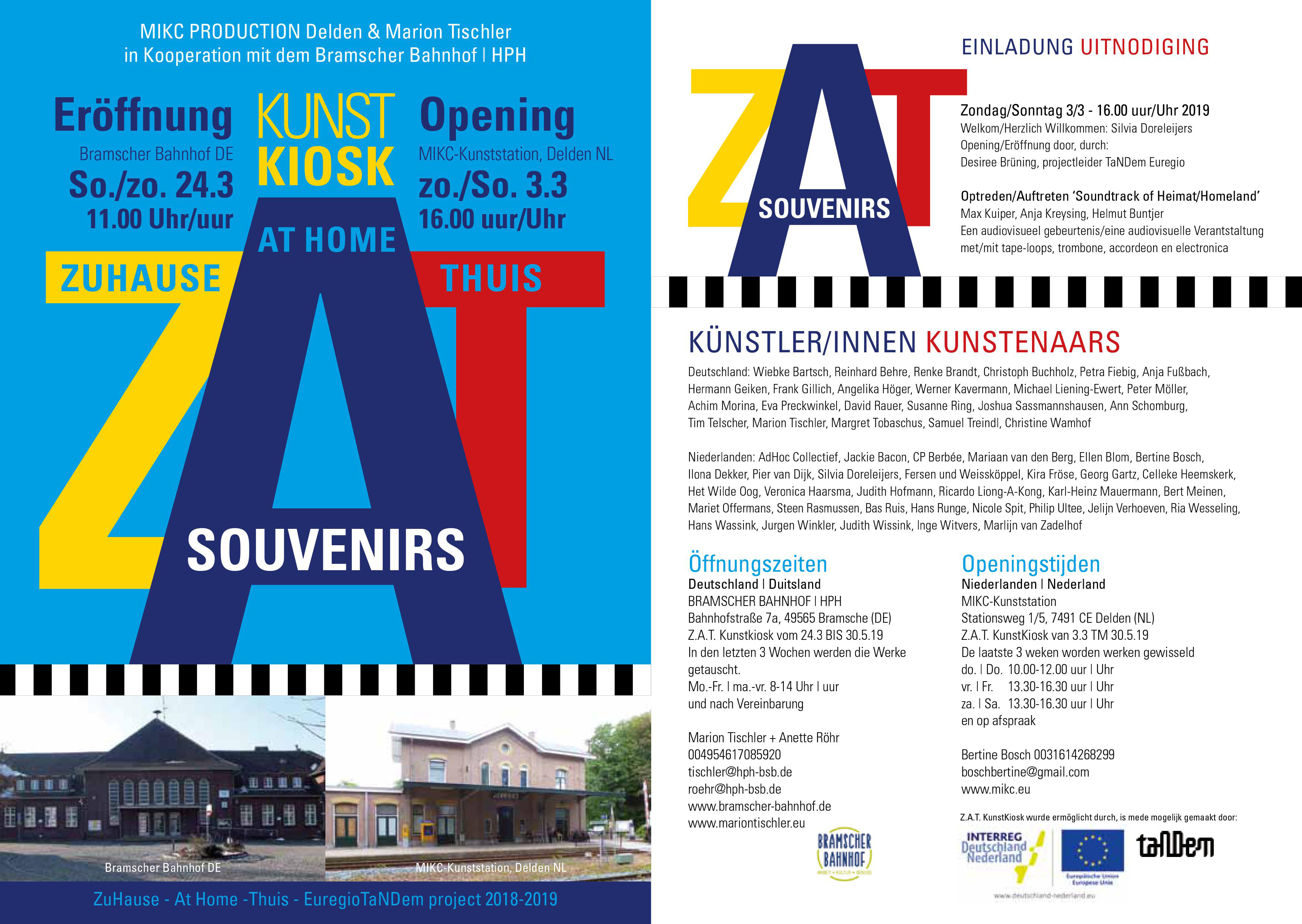 ‘Het thuisgevoel op reis meenemen, maar ook je thuis voelen in een nieuw land. Hoe zou je dat kunnen bewerkstellingen? De ZAT souvenirs laten zien hoe een souvenir kan appeleren aan het thuisgevoel of je in gedachten weer even thuis kan laten zijn. In Delden en in Bramsche zijn kiosken gebouwd met kunstsouvenirs over verlangen en heimwee naar…… te zien in twee voormalige stationsgebouwen die door de reis verbonden zullen worden. Een Euregio Tandem project van Marion Tischler/ Bramscher Bahnhof DE en MIKC/Kunststation Delden NL( maart-april 2019) waar ik met twee ontwerp souvenirs aan deelneem. Ik heb een ontwerp gemaakt voor een draagbaar medaillon met de tekst ’transit umbra, lux permanet'(schaduw gaat, licht blijft) en een vlaggenlijn met als titel ‘pleased to meet you’ (hier of elders). De afbeeldingen zijn bewerkingen van tekeningen van mijn hand.